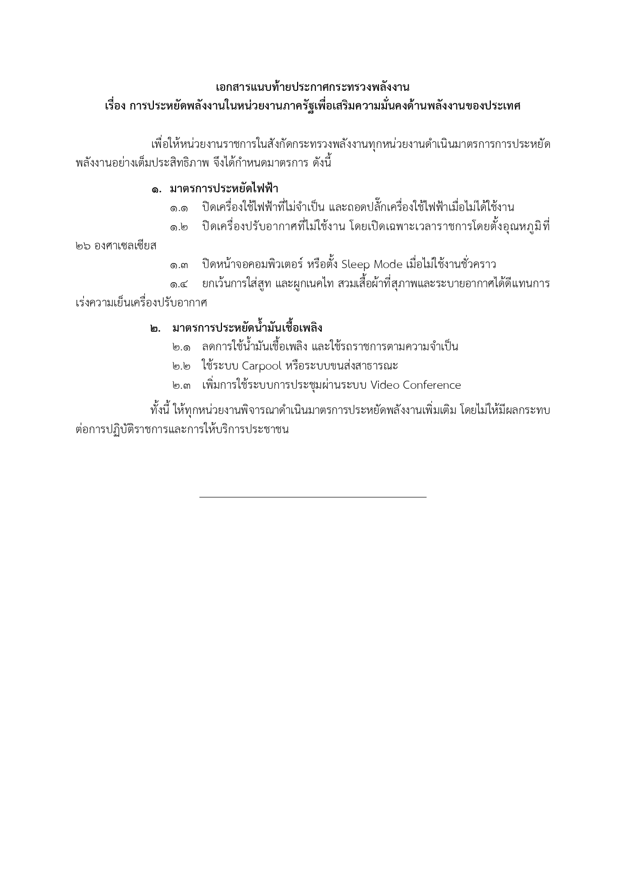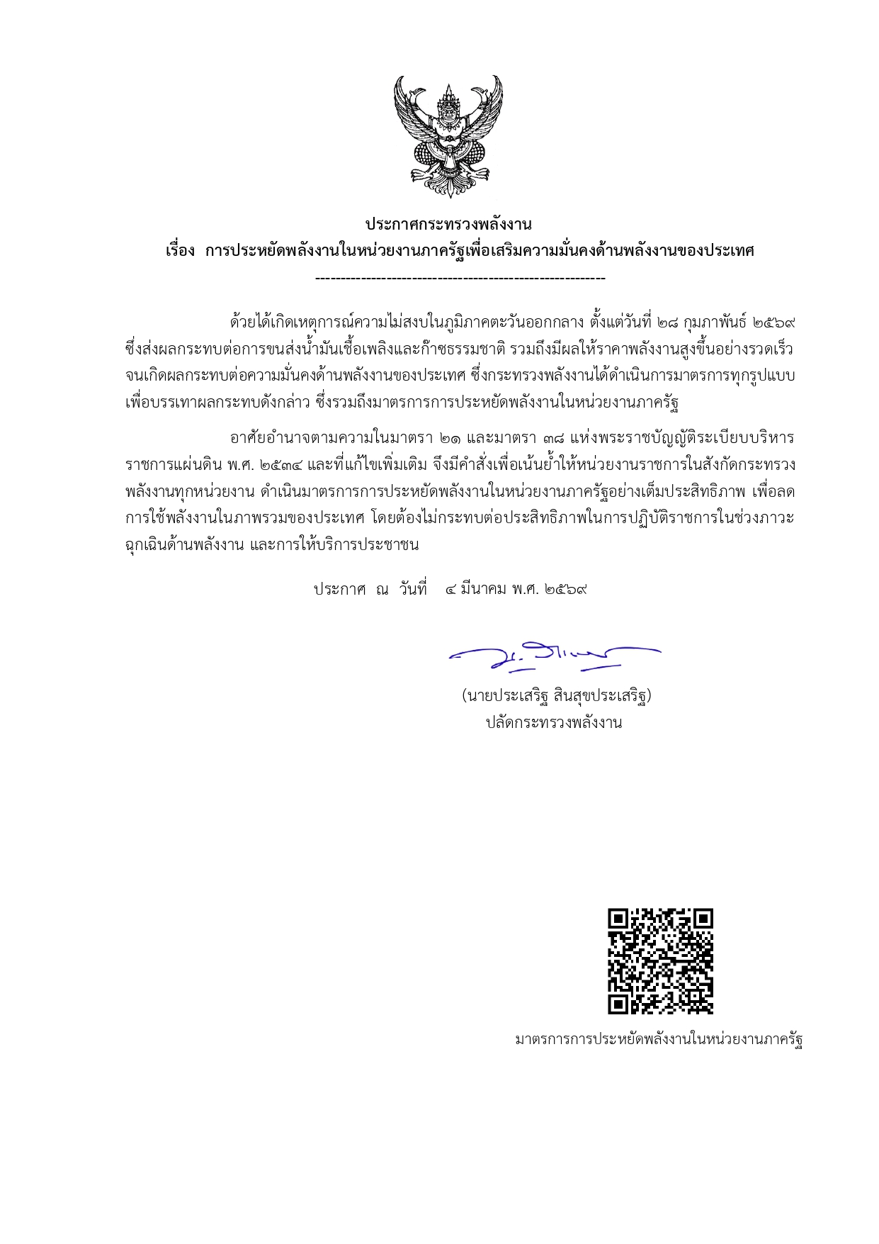 สำนักงานพลังงานจังหวัดจันทบุรี ประชาสัมพันธ์ประกาศกระทรวงพลังงาน เรื่อง การประหยัดพลังงานในหน่วยงานภาครัฐเพื่อเสริมความมั่นคงด้านพลังงานของประเทศ เพื่อให้หน่วยงานราชการดำเนินมาตรการลดการใช้พลังงานอย่างมีประสิทธิภาพ ภายหลังสถานการณ์ความไม่สงบในภูมิภาคตะวันออกกลางที่ส่งผลกระทบต่อการขนส่งน้ำมันเชื้อเพลิงและก๊าซธรรมชาติ ซึ่งอาจทำให้ราคาพลังงานปรับตัวสูงขึ้นและกระทบต่อความมั่นคงด้านพลังงานของประเทศ