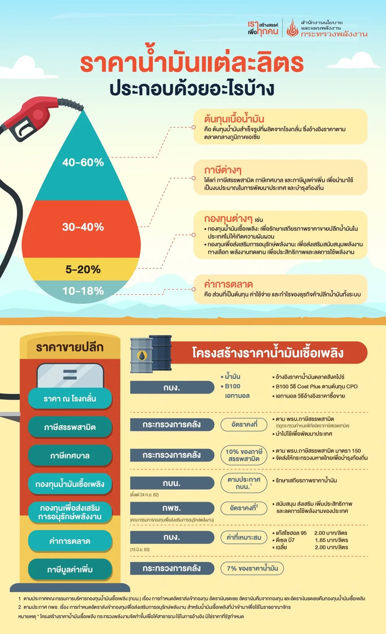 ทั้งนี้ โครงสร้างราคาน้ำมันเชื้อเพลิงยังประกอบด้วยรายการสำคัญ เช่น ราคาน้ำมัน ณ โรงกลั่น ภาษีสรรพสามิต ภาษีเทศบาล กองทุนน้ำมันเชื้อเพลิง กองทุนเพื่อส่งเสริมการอนุรักษ์พลังงาน ค่าการตลาด และภาษีมูลค่าเพิ่ม ซึ่งแต่ละรายการมีหน่วยงานที่กำกับดูแล เช่น กระทรวงพลังงาน กระทรวงการคลัง และหน่วยงานที่เกี่ยวข้อง