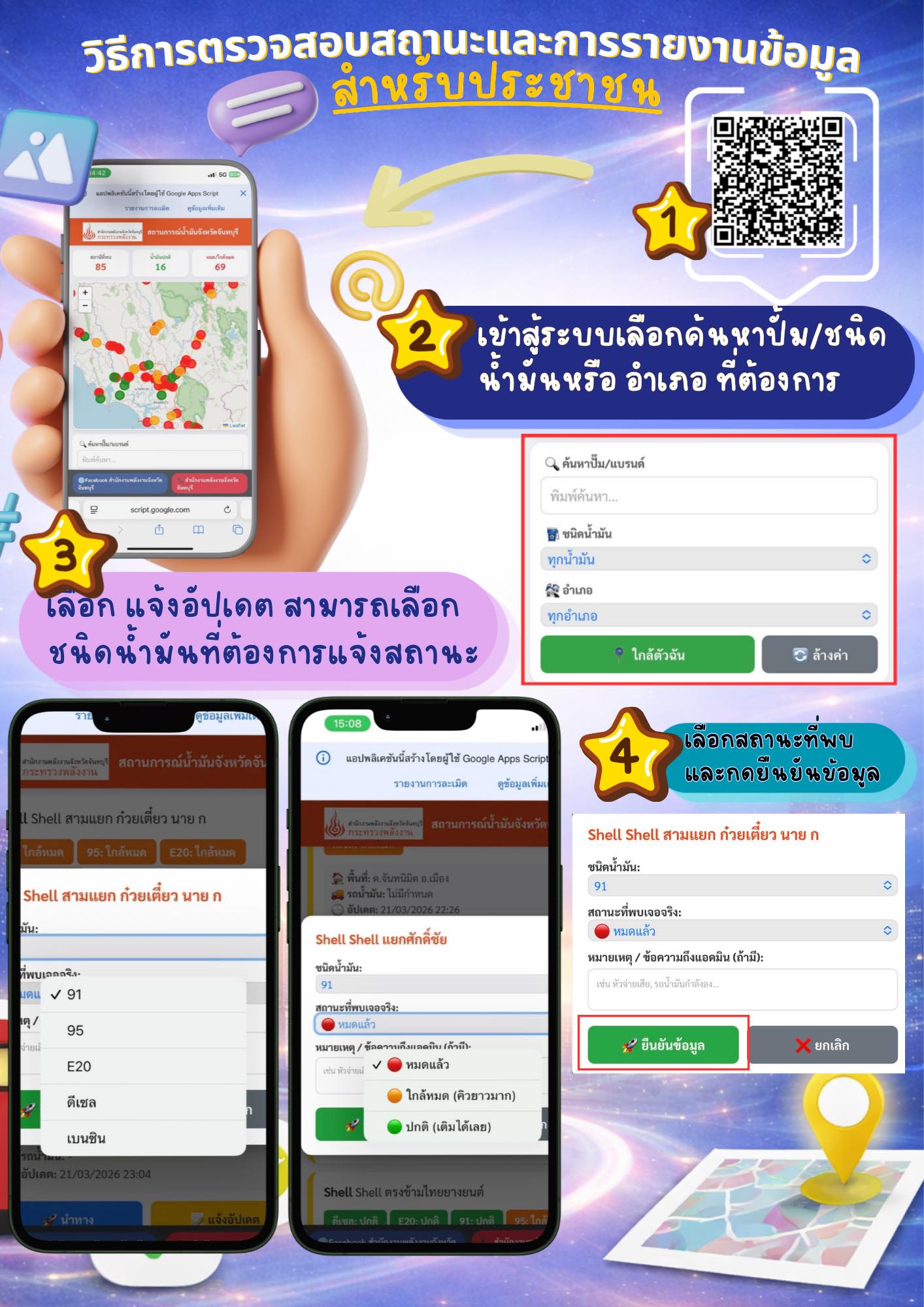 ?? ข้อมูลที่ท่านแจ้งจะช่วยให้หน่วยงานสามารถติดตามสถานการณ์น้ำมันเชื้อเพลิงในพื้นที่ได้อย่างรวดเร็ว และเป็นประโยชน์ต่อประชาชนในการวางแผนการเดินทาง